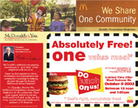 McDonald's Conspiracy was a group effort. The project aimed at challenging some of the norms of public and private space. The creation and distribution of a fake coupon effectively did two things. It embraced the nature of a coupon as a system and enhanced it. *that's right, completely free. The project was to distribute the coupons through the city paper and document the consumers that try to redeem them. The project is huge, socially, culturally, interactively. There certainly was a certain demographic that attempted to redeem the coupon. The McDonald's had a systematic and immediate response to the influx of angry customers. I designed the coupon and managed the project team from start until execution whereby individuated tasks were created to document the event. I wore a wired microphone and documented audio of the event.